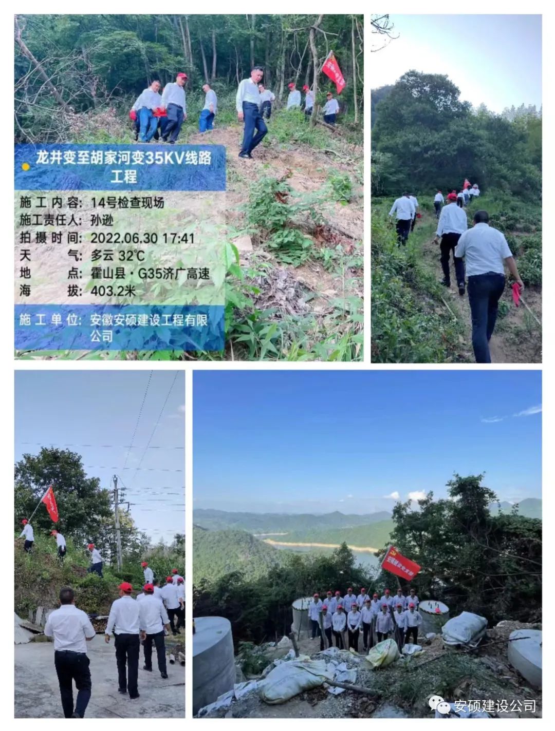 6月30日下午,参观安徽六安霍山县龙井变-胡家河变35kV线路工程,党建引领铸精品,深入推动“党建进工地”,带动党的建设与项目建设双融合、双促进。在工地现场悬挂党建标语、条幅,党员全部佩戴党员徽章,亮身份、做表率,做到支部在哪里、阵地在哪里、党员先锋模范作用就发挥在哪里。